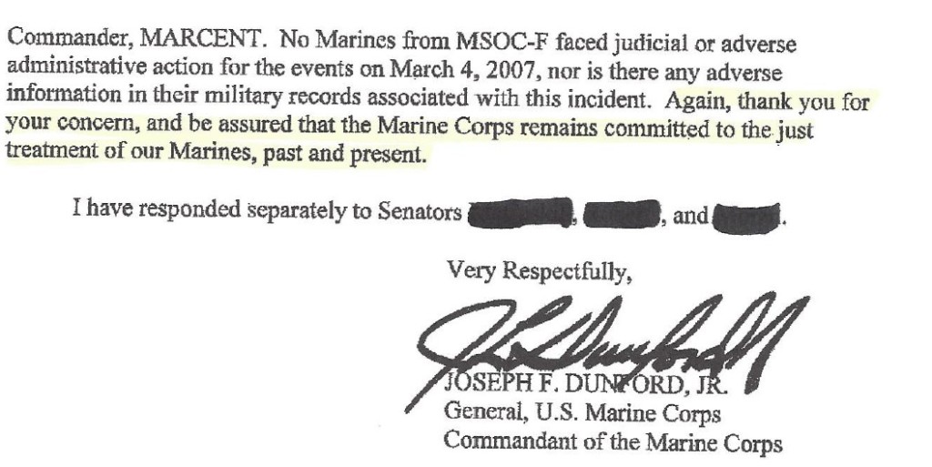 In 2015, a letter from then-Commandant of the Marine Corps, General Dunford, who is now the chairman of the Joint Chiefs of Staff, responded to one of the four U.S. senators and one U.S. congressman who inquired in June of 2015 regarding the MARSOC case. The senator’s letters to General Dunford were dated 8 June, 2015, and General Dunford’s response to the senator came 16 days later, on 24 June, 2015. Attorneys for both Fred Galvin and Steve Morgan are still frequently engaged with MARCENT SJA’s office, urging the release of the testimony of the Marine officer that has been requested and the NCIS interview audio and video recordings.