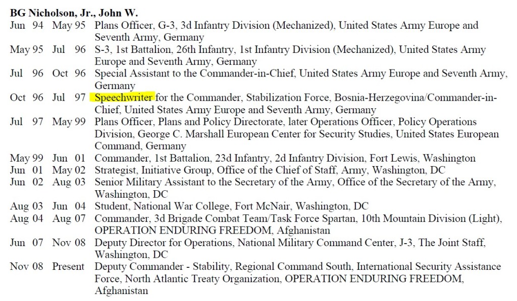 The speech-writer assignment is no longer part of his official biography. It is something he likely does not need to worry about promoting, now that he has already been tapped to take the lead command in Afghanistan. He is an intellect’s and not a warrior’s warrior. SOFREP has reached out to General Nicholson’s NATO land command office prior to his change of command, but has yet to hear back.