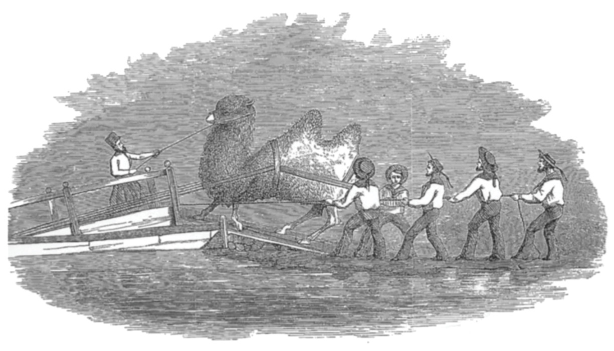 The embarkation of a Bactrian on the USS Supply. Since Artist Heap took the trouble to record the loading of this particular animal, it is possibly the gigantic Bactrian that required Lieutenant Porter to modify the Supply. (Drawing by G. Wynn Heap, artist with the first expedition to acquire camels from the Mid·East. From Reports Upon the Purchase, Importation and Use of Camels and Dromedaries, 1855-‘ 56-’57/armyupress.army.mil)
