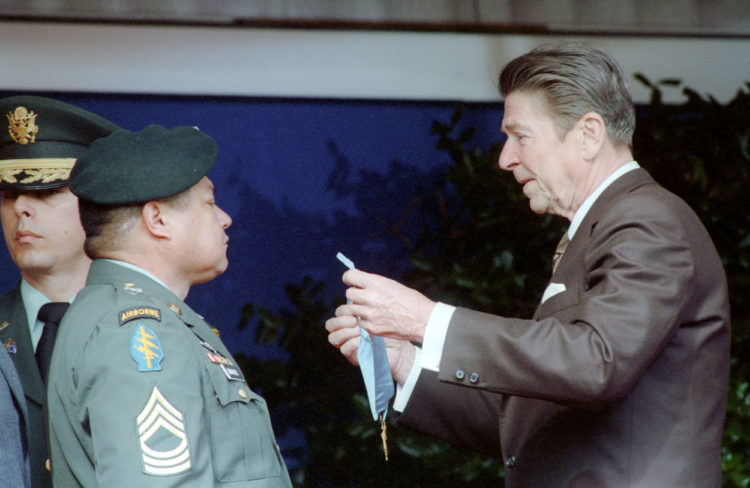 President Ronald Reagan stands beside Medal of Honor recipient retired MSGT Roy P. Benavidez, U.S. Army, during a ceremony at the Pentagon. (Source: National Archives at College Park – Still Pictures, Public domain, via Wikimedia Commons)