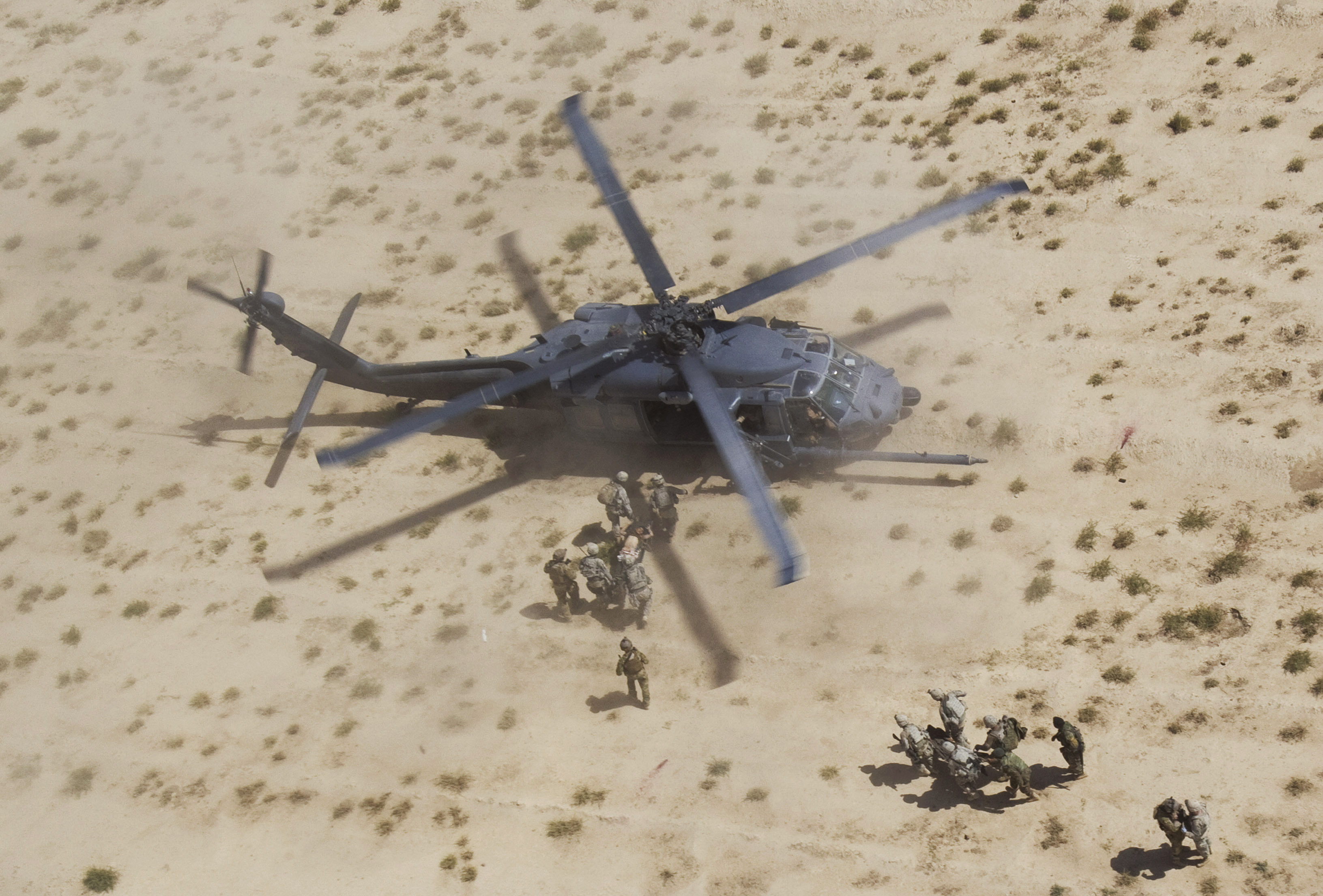 Two Afghan army soldiers, who were wounded in an IED explosion, are carried into a U.S. Air Force HH-60G Pave Hawk helicopter to be evacuated to Kandahar Air Field in Afghanistan’s Kandahar province on Sunday, Oct. 3, 2010. Air Force pararescuemen and helicopter pilots from the 46th and 26th Expeditionary Rescue Squadrons are supporting ongoing military operations in southern Afghanistan. (AP Photo/David Guttenfelder)