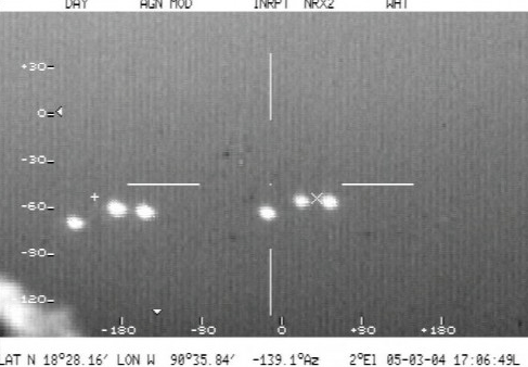 The WSO resorted to the FLIR pod on board, slaving it to the weak track the RWS mode had been able to generate. He recorded the following sequence to the on-board recorder. Using the IR mode, he was able to lock onto the AAV. It showed up on his screen and on tape as a white object in a black background hovering with no known means.