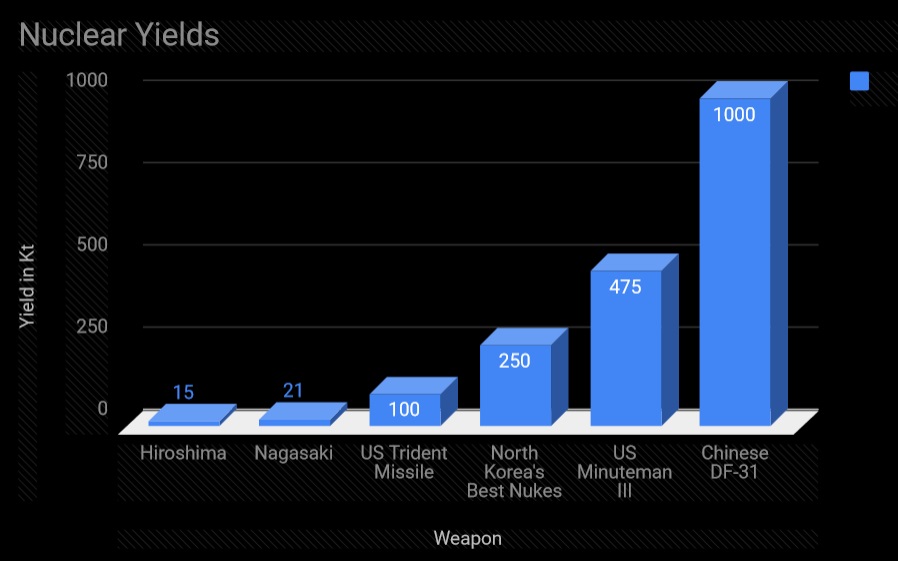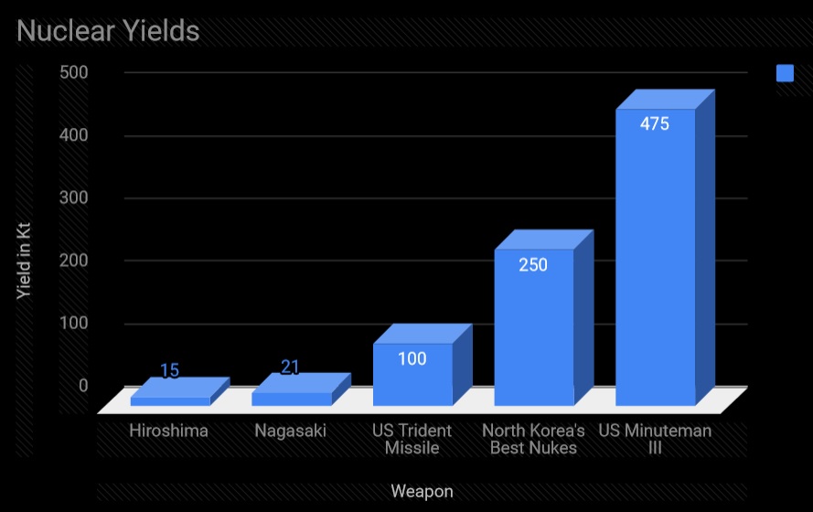 So let’s begin with a comparison of the bombs dropped on Hiroshima and Nagasaki at the end of World War II, along with America’s modern long-range nuclear missiles and North Korea’s first thermonuclear detonation from last year. The following figures are shown in kilotons (or per 1,000 pounds of TNT in equivalent destructive capacity):