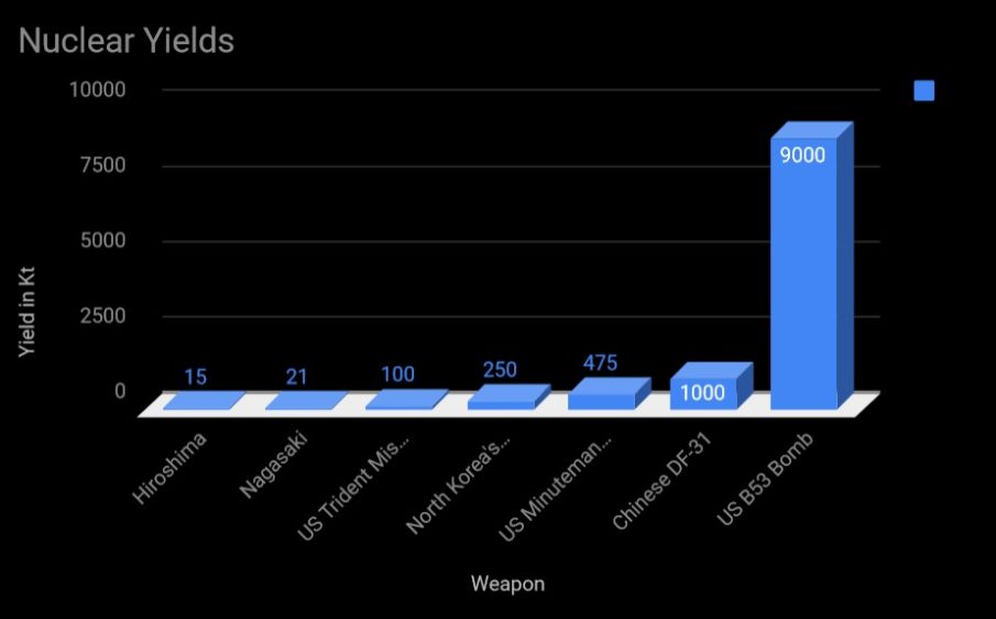 That chart seems to indicate a significant increase in the destructive yield of these weapons since their first (and only) use in combat more than seventy years ago. However, America’s workhorse Minuteman III has been around since 1970 (with some updates along the way), and as such, it doesn’t stack up nearly as well when we start including China and Russia’s latest platforms (though America does have one ace up their sleeve in the form of an extremely powerful nuclear bomb).