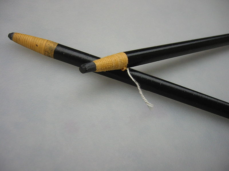 A grease pencil (UK chinagraph pencil) is made of hard colored wax and is useful for marking on hard, glossy surfaces such as porcelain or glass. (carol, CC BY-SA 3.0, via Wikimedia Commons)