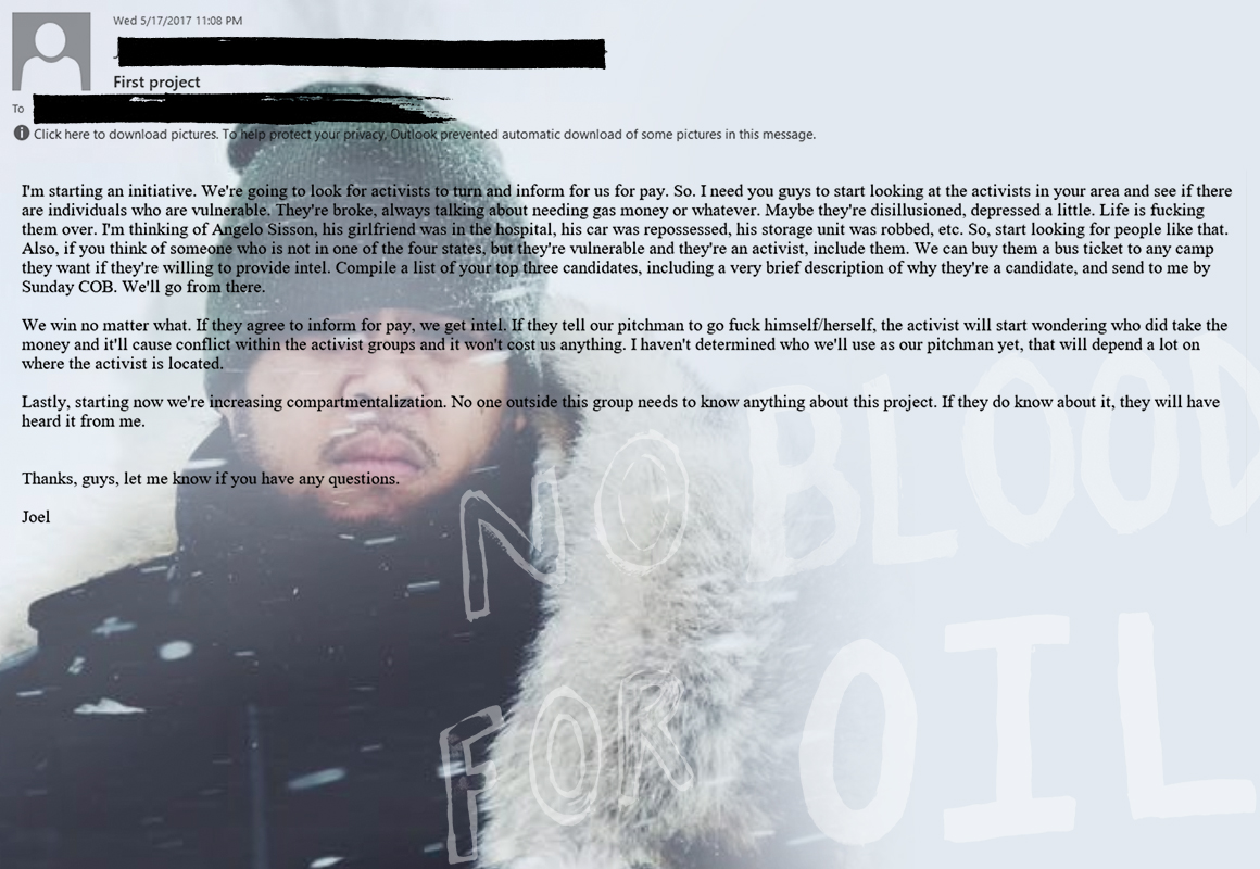 A internal TigerSwan e-mail written by one of their HUMINT contractors at Standing Rock describes an initiative to begin blackmailing protesters who are assessed as being vulnerable to exploitation. In this case, Angelo Sisson, was never recruited, only targeted. (Picture: Facebook)