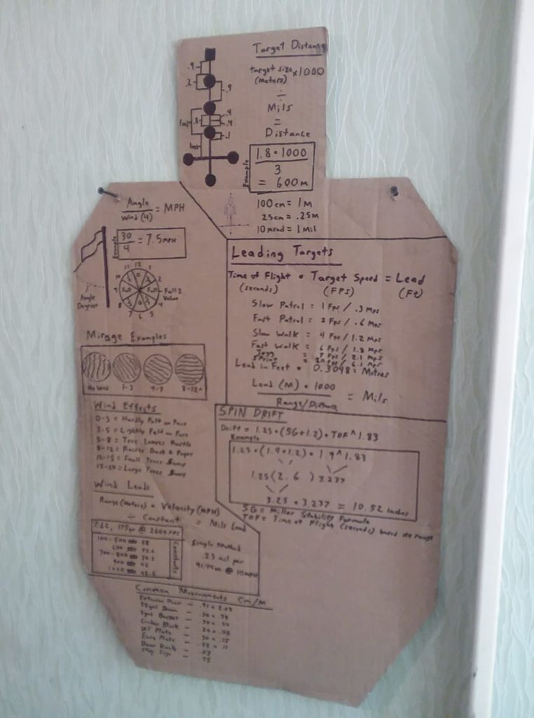 We later moved out to a bigger range with a far greater potential for long distance shooting, it was close to 1000 meters at the farthest steel plate. We would generally warm-up with an easy 300 meters and a good zero confirmation point at that. We would slowly work out to farther targets from there. We practiced using our physical math, ballistic programs and various tools like the protractor, calculator and wind reader. Of course we had range finders and understood how to read wind-flags, but we had a known target size and mil-dot reticle, so easy day.