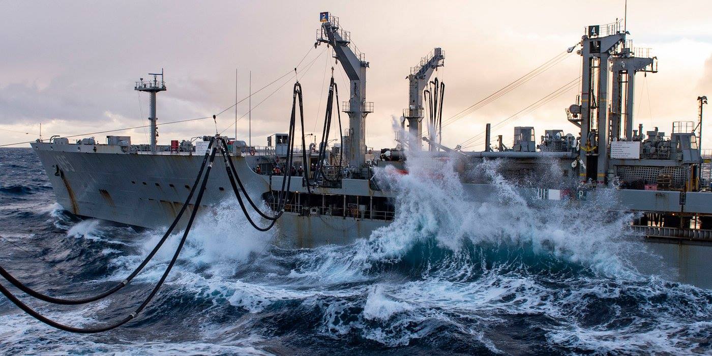 The Fleet Replenishment Oiler USNS Leroy Grumman (T-AO 195) steamed alongside the Wasp-class amphibious assault ship USS Iwo Jima (LHD 7) during a replenishment-at-sea, Oct. 27, 2018. Iwo Jima participated in Trident Juncture 2018, which was a NATO-led exercise designed to certify NATO response forces and develop interoperability among participating NATO Allied and partner nations. (U.S. Navy photo by Mass Communication Specialist 3rd Class Joe J. Cardona Gonzalez/Released).