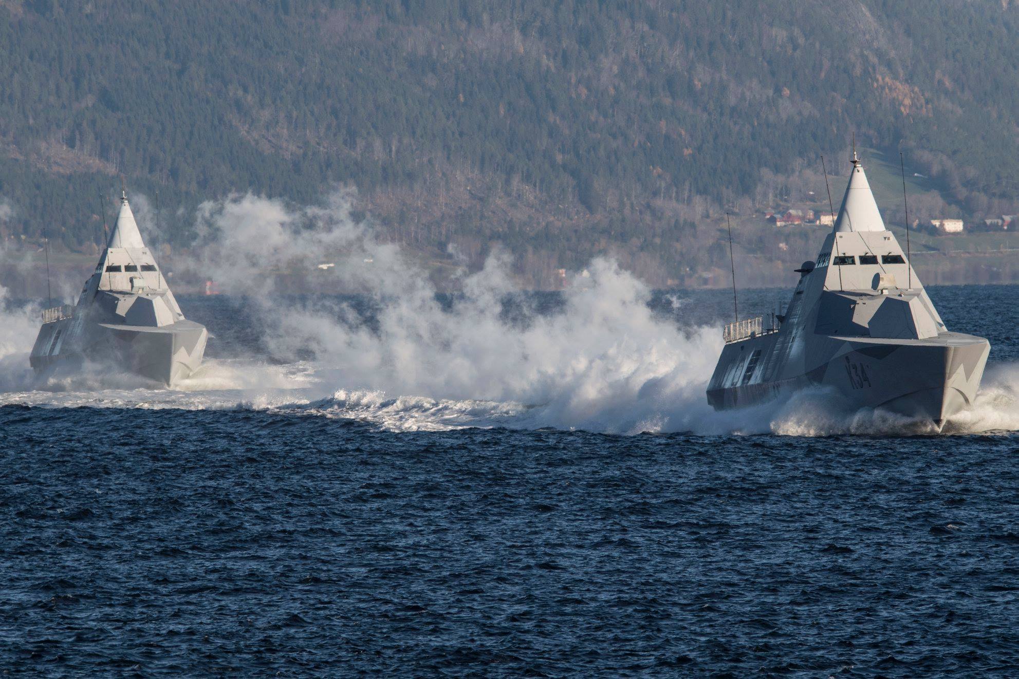 Royal Swedish Navy corvettes HSwMS Nykoping and HSwMS Karlstad as they sailed in the Trondheim fjord during a NATO Capabilities Demonstration on October 29, 2018, in Norway as part of NATO exercise Trident Juncture. Photo: MCpl Andre Maillet.