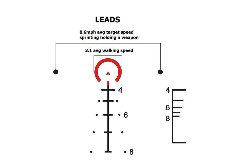 As per the ACSS insert that came with the ACOG manual, these lead calls are best used between 100-300 yards. This isn’t intended to give the mathematical solution to every possible angle or movement speed. The ACSS reticle simply and quickly lets the shooter put a hit on a target moving perpendicular to the shooters line of fire, either walking or running.