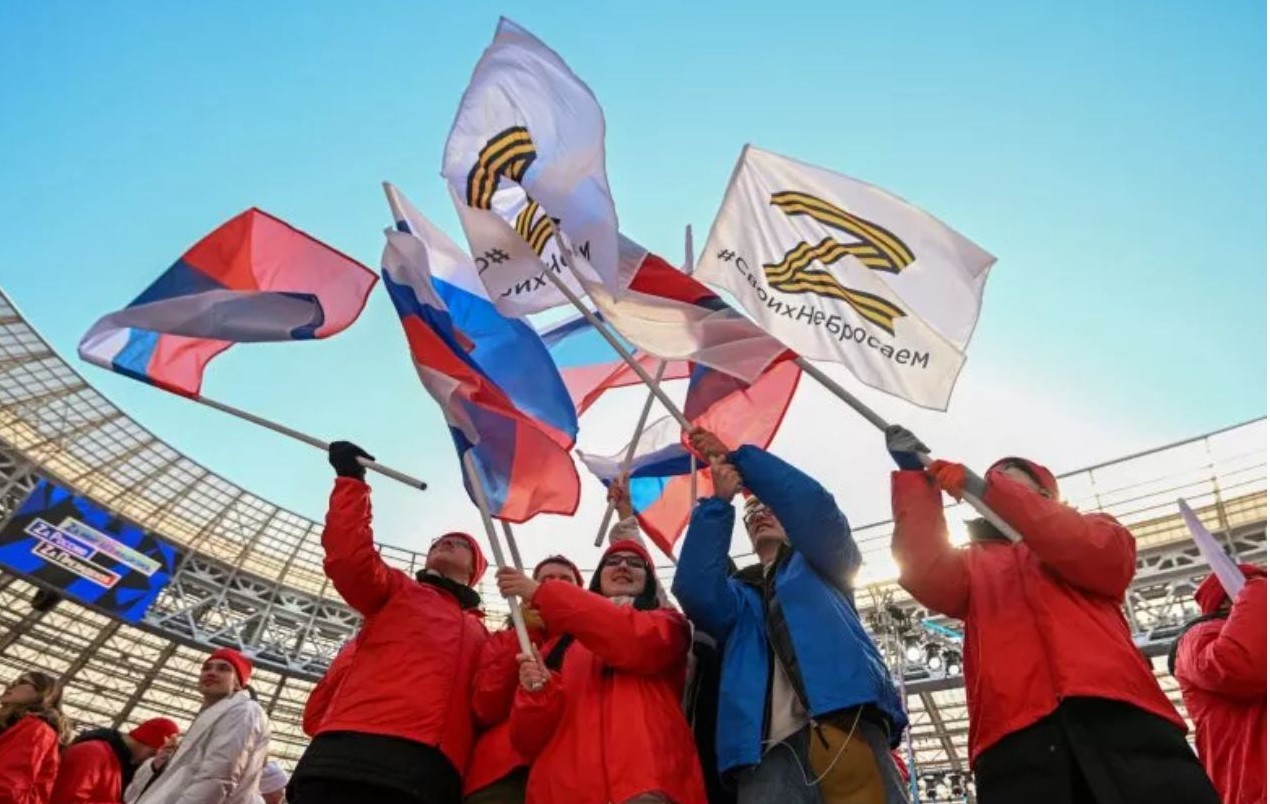 Luzhniki Stadium, Moscow: People wave flags with the letter Z in the colors of the ribbons of St. George as a symbol of support for Russian military actions in Ukraine. Ramil Sitdikov/Pool/AFP via Getty Images