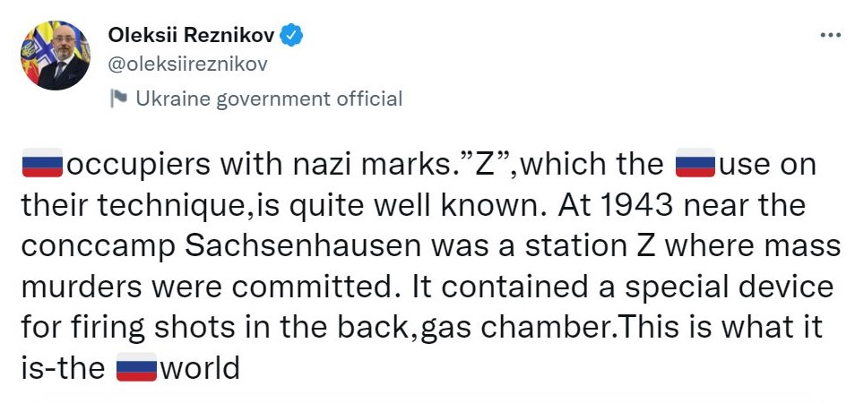 Ukrainian Defense Minister Oleksii Reznikov went as far as to call the Z symbol a “Nazi mark” on Twitter.