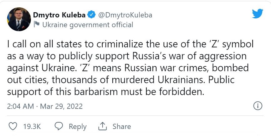 “I call on all states to criminalize the use of the ‘Z’ symbol as a way to publicly support Russia’s war of aggression against Ukraine.”