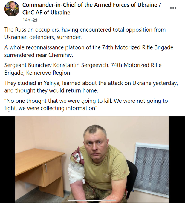 - The Facebook account of Ukraine's commander in chief, Lt. Gen. Valerii Zaluzhnyi, reported the surrender of a Russian platoon near Chernihiv, 85 miles north of Kyiv.