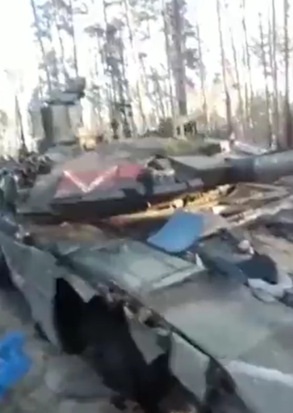 A Russian T-90 tank said to have been found in the forest by Ukrainian troops near the town of Kriminna. It appears to be disabled by the absence of a left track.
