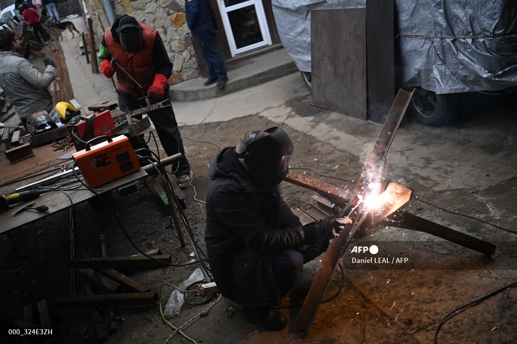 Lviv locals making ‘Czech hedgehogs’ to scupper Russian tanks. Image credit: Twitter @lealolivas
