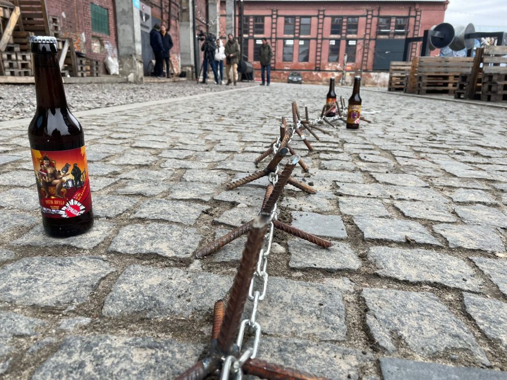A line of homemade caltrops and victory beer protect the Lviv brewery. Image courtesy of wbur.org