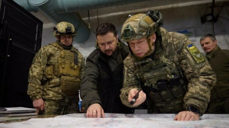 Ukrainian President Volodymyr Zelensky (center) is shown here with Colonel General Oleksandr Syrski (right) in this November 2023 photo.