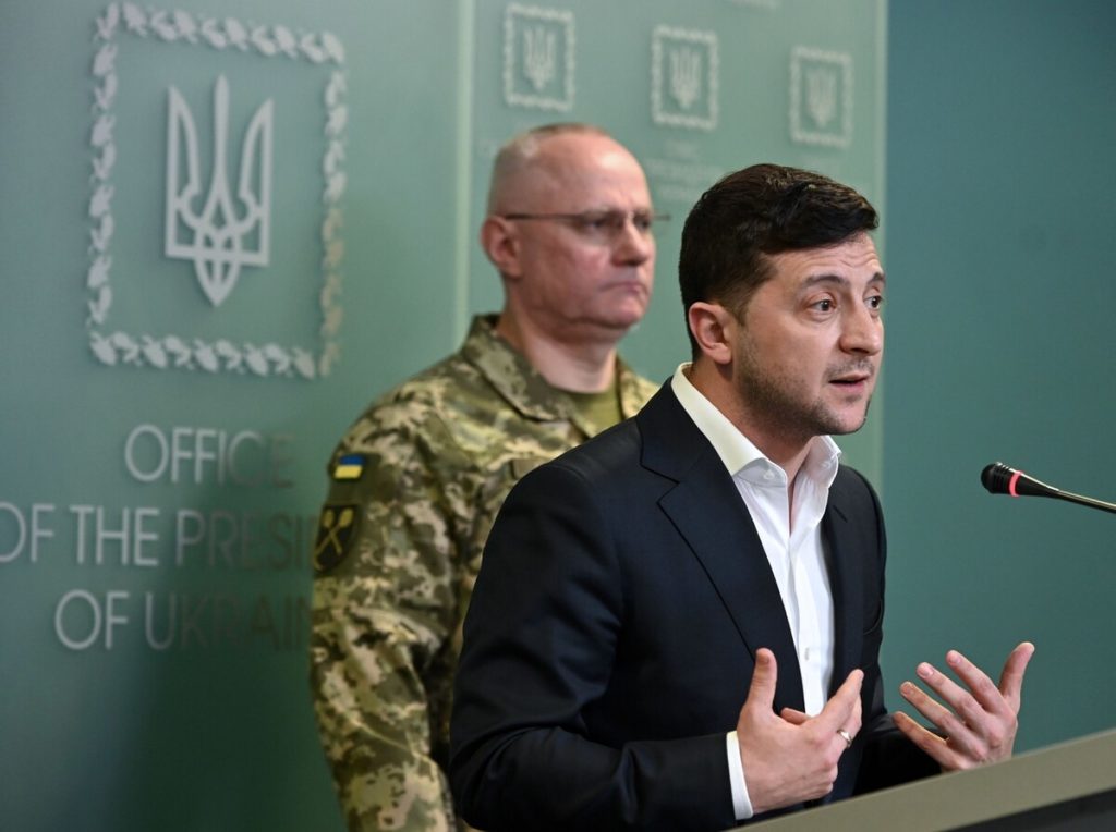 Ukrainian President Volodymyr Zelenskiy, flanked by Ruslan Khomchak, military commander of Ukraine’s military, speaks at a briefing following an outbreak of violence with pro-Russian separatists on Feb. 18, 2020.