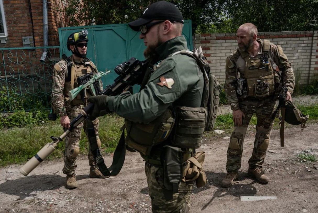 Kraken Regiment members in Ruska Lozova. The soldier front and center is sporting a patch representing the great state of Texas. In other photos, some have been wearing subdued US Flag patches on their uniform. Image Credit: Wojciech Grzedzinski