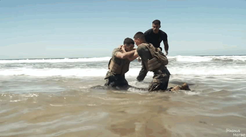 The Marines, of course, came up with a more physically taxing version: Shallow water grappling. Both combatants start on their knees, and the objective is to pin the other person down on their back and submerge their head into the water. All while wearing a 20-pound plate carrier on their chests.