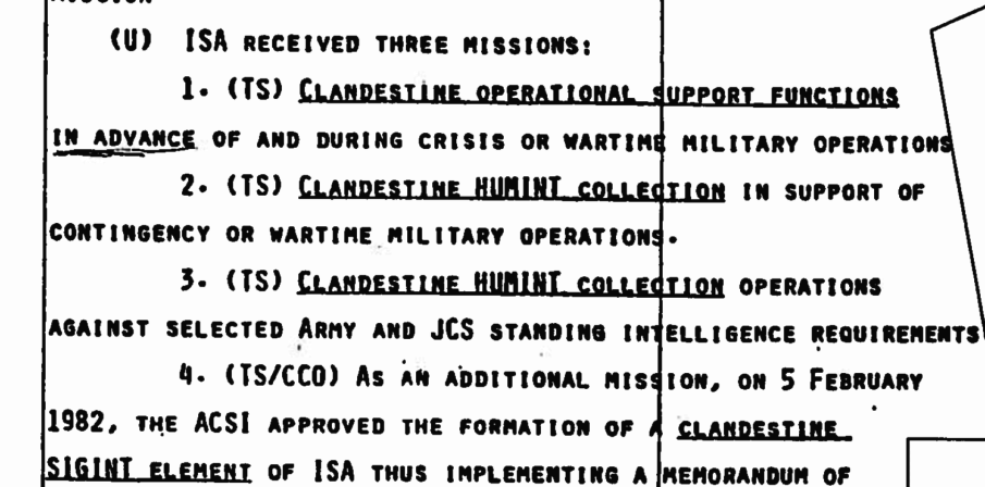 A declassified document provides background information about the Intelligence Support Activity (ISA), a little known intelligence gathering unit that collects tactical intel for Joint Special Operations Command (JSOC) and other Special Operations units. While units like SEAL Team Six hog the headlines, smaller compartmentalized organizations slide below the radar.