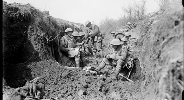 The photo captures soldiers during mealtime in the frontline trench, within 250 yards of the enemy, circa 1918. (Image source: Wikimedia Commons)