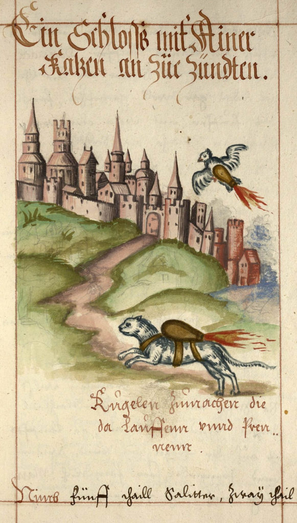 In the 16th century, at a time when animal cruelty was not a crime yet, artilleryman Franz Helm from Cologne, who was said to be one of those who fought against the Turks in south-central Europe, wrote a book on munitions, weapons, and artillery. In his book, he wrote in detail how they could use cats and cause havoc in a defensive system or town that they would perhaps want to besiege. He wrote,