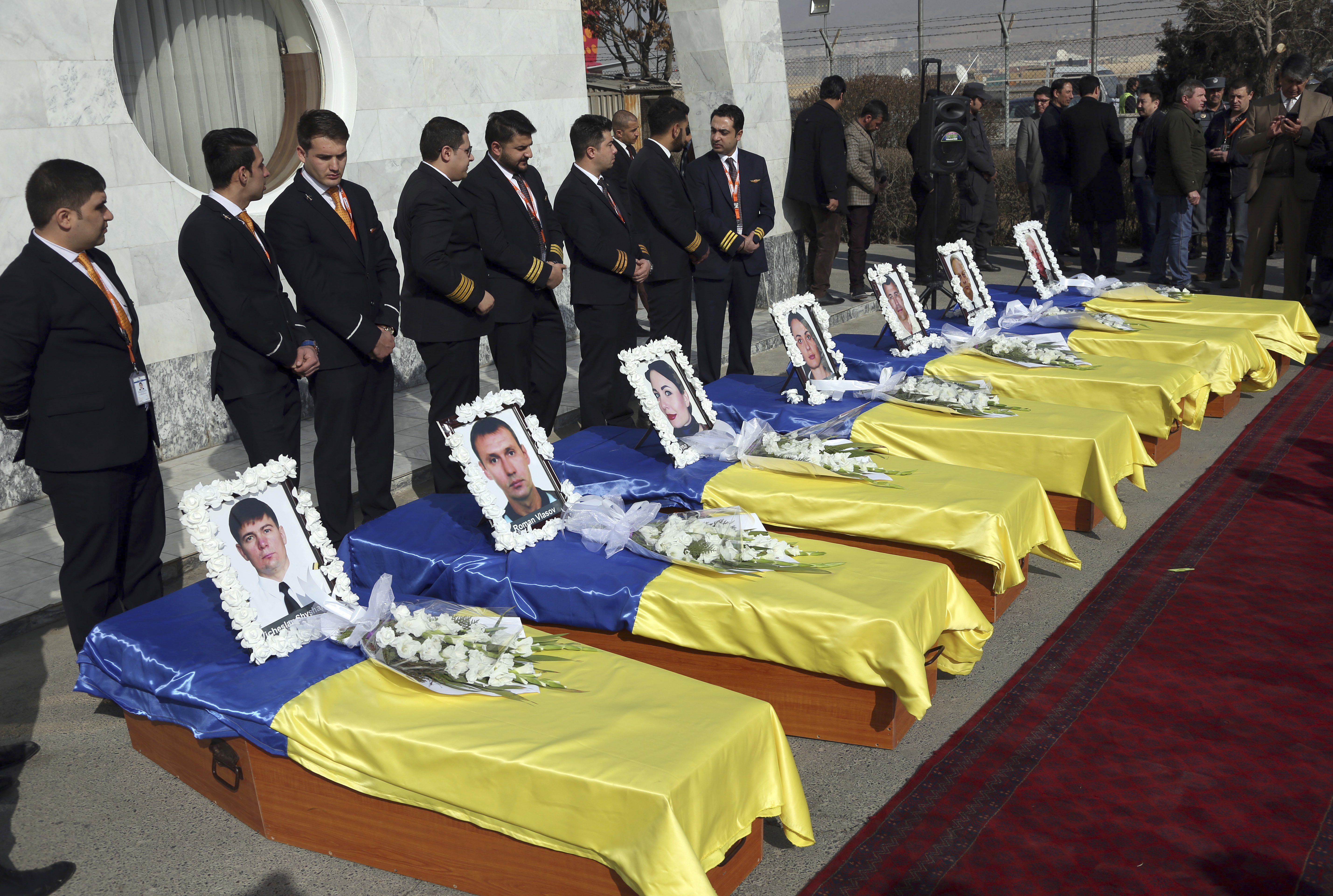 Portraits and coffins of Ukrainian employees of the Kam Air Afghan airline arrive at the international airport in Kabul, Afghanistan, Wednesday, Jan. 24, 2108. | AP Photo/Rahmat Gul