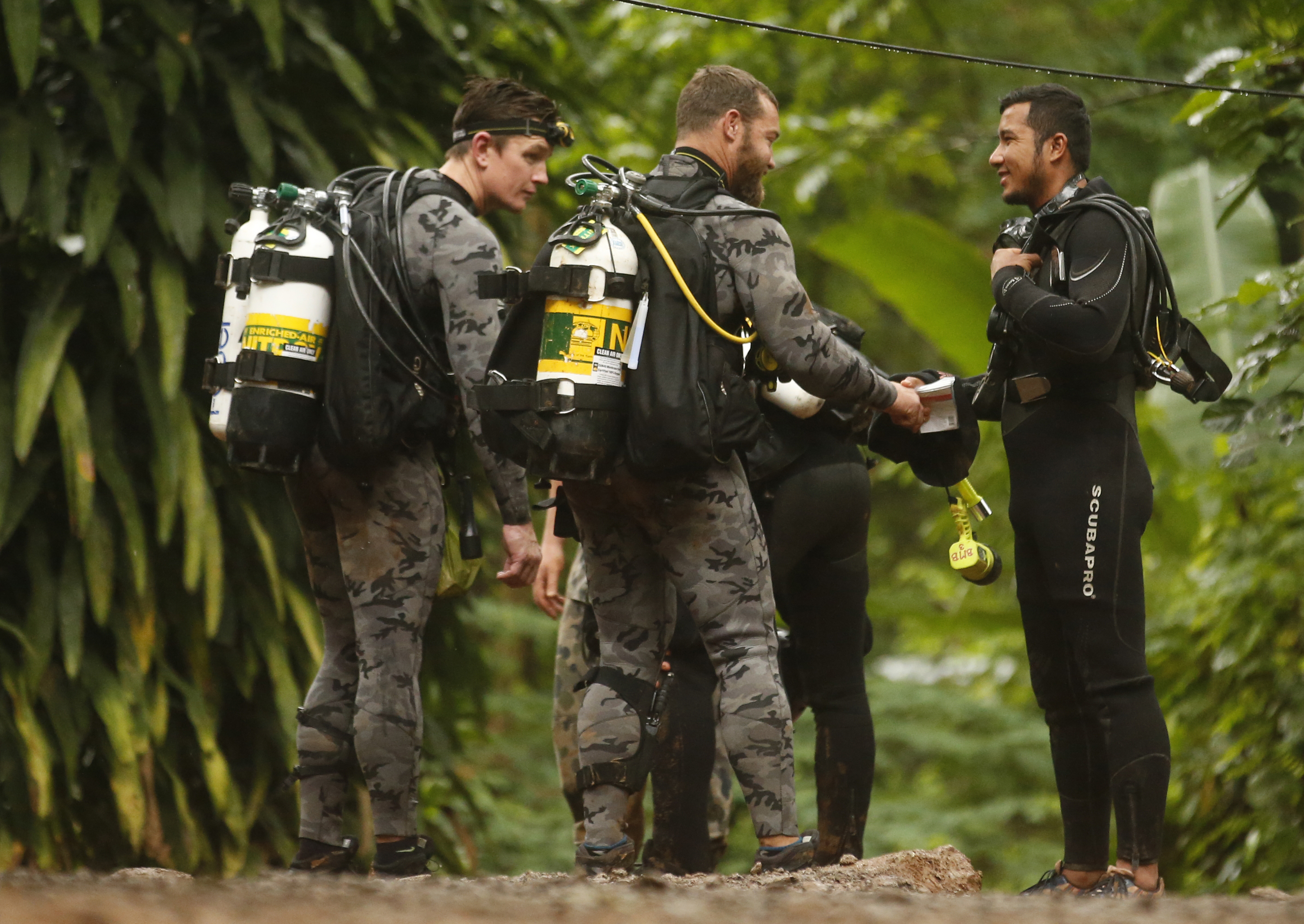Australian Federal Police and Defense Force personnel talk to a Thai rescuer, right, before diving after the 12 boys and their soccer coach. | AP Photo/Sakchai Lalit