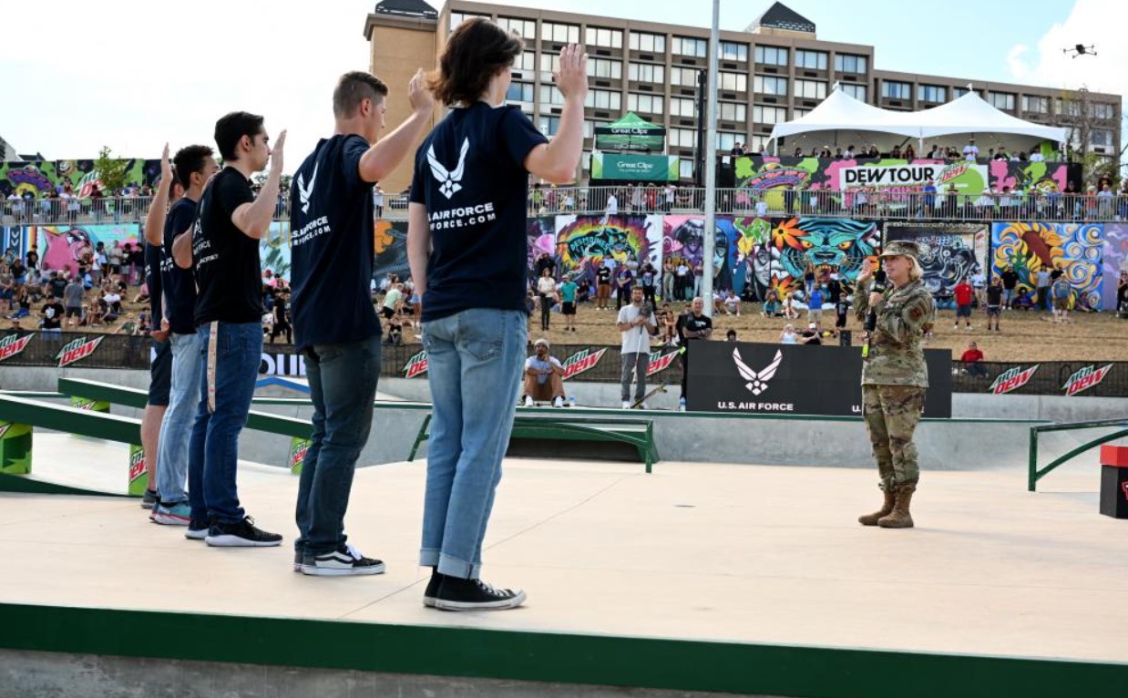 U.S. Air Force Maj. Sarah Answine, Director of Operations 343rd Recruiting Squadron, conducts the Oath of Enlistment to five Air Force recruits in a Swearing-In Ceremony at Dew Tour in Des Moines, Iowa, July 29, 2022. Once sworn into the Air Force, the recruits became part of the Delayed Entry Program (DEP) and await their ship date for Basic Military Training. (U.S. Air Force Photo by Tech. Sgt. Jessica B. Kind/Released)