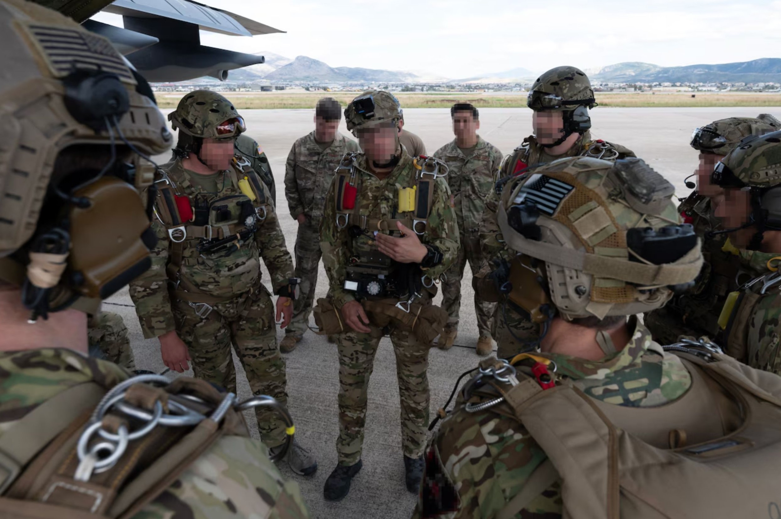 A SOF jumpmaster briefs jumpers prior to boarding an MC-130J Commando II for a joint free fall exercise with US and Greek special operators. March 5th, 2024, near Athens, Greece. Image Credit: Air Force Tech. Sgt. Westin Warburton