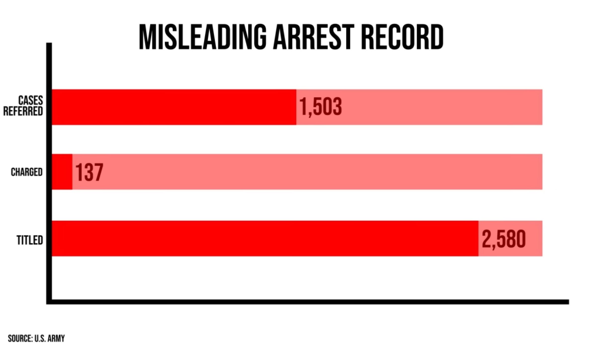 Only a tiny fraction of those titled by CID was ever charged with a crime. Screenshot from YouTube and NBC News. Data Source: US Army