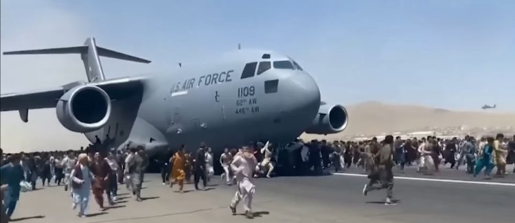 Desperate Afghans take to the runway in Kabul while an American flight takes others to safety in late August, 2021. Image Credit: NBC News
