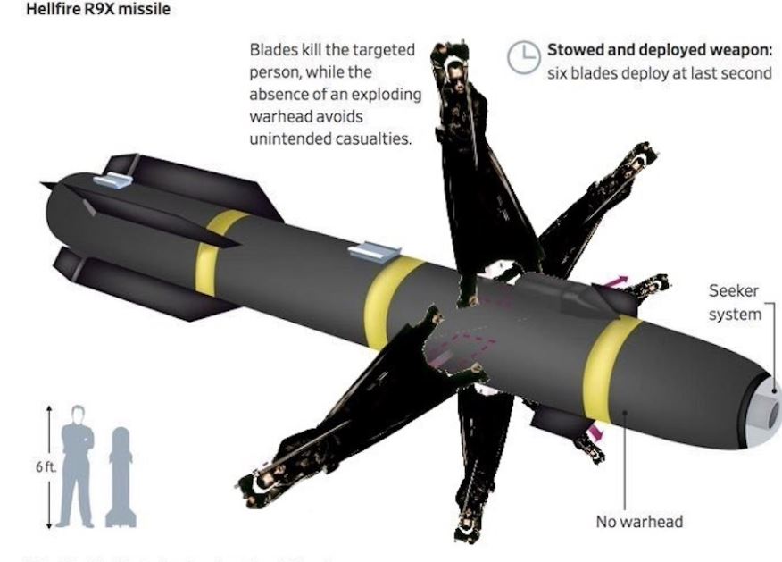 It is officially designated as Hellfire AGM-114R9X — usually shortened to R9X and sometimes known as the “Flying Ginsu” or the “Ninja Bomb.”