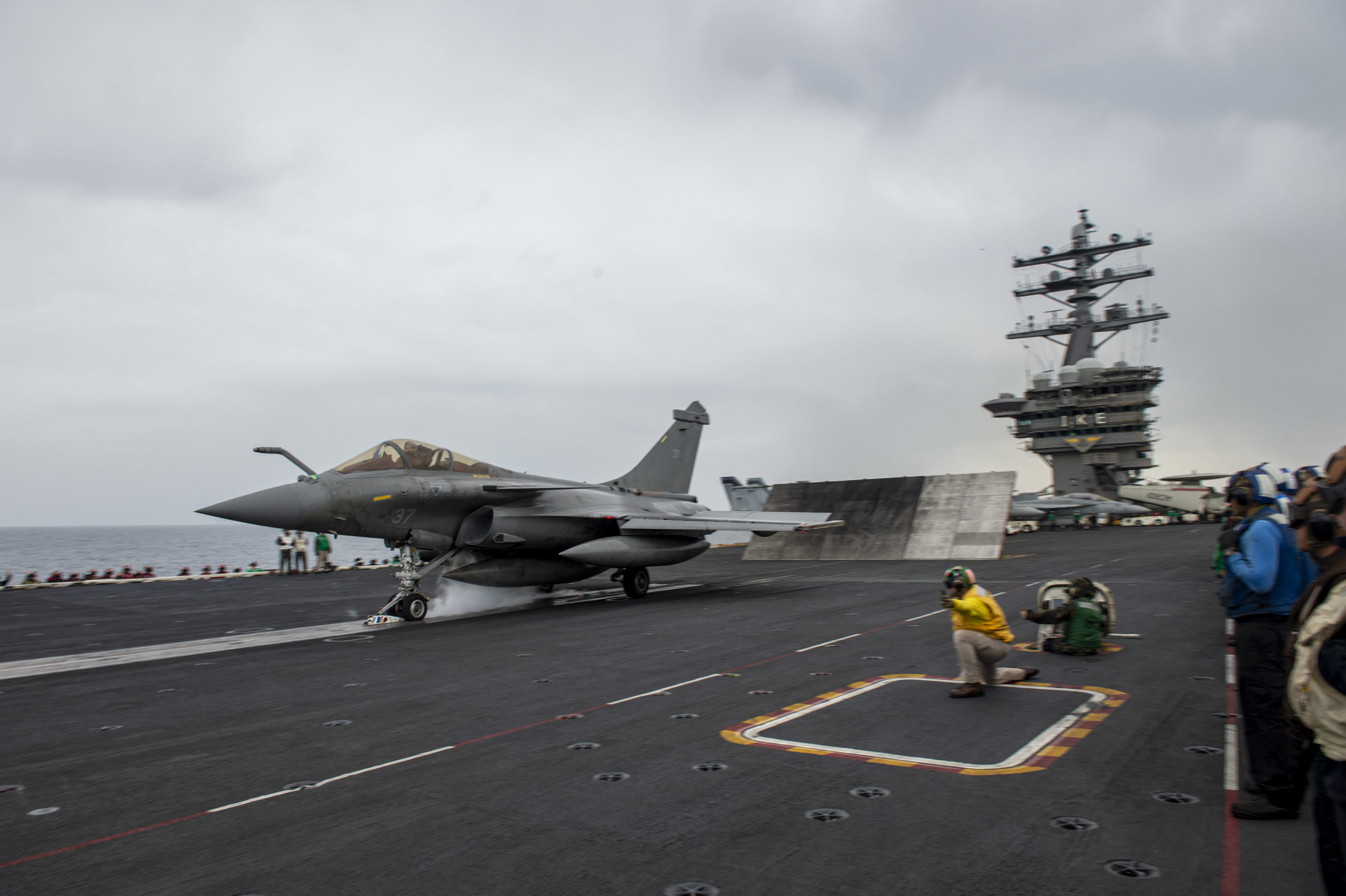 200303-N-OX360-1016 A French Dassault Rafale M fighter jet launches from the aircraft carrier USS Dwight D. Eisenhower (CVN 69). Ike is conducting operations in the Mediterranean Sea as part of the Dwight D. Eisenhower Carrier Strike Group. (U.S. Navy photo by Mass Communication Specialist 3rd Class James Norket/Released)