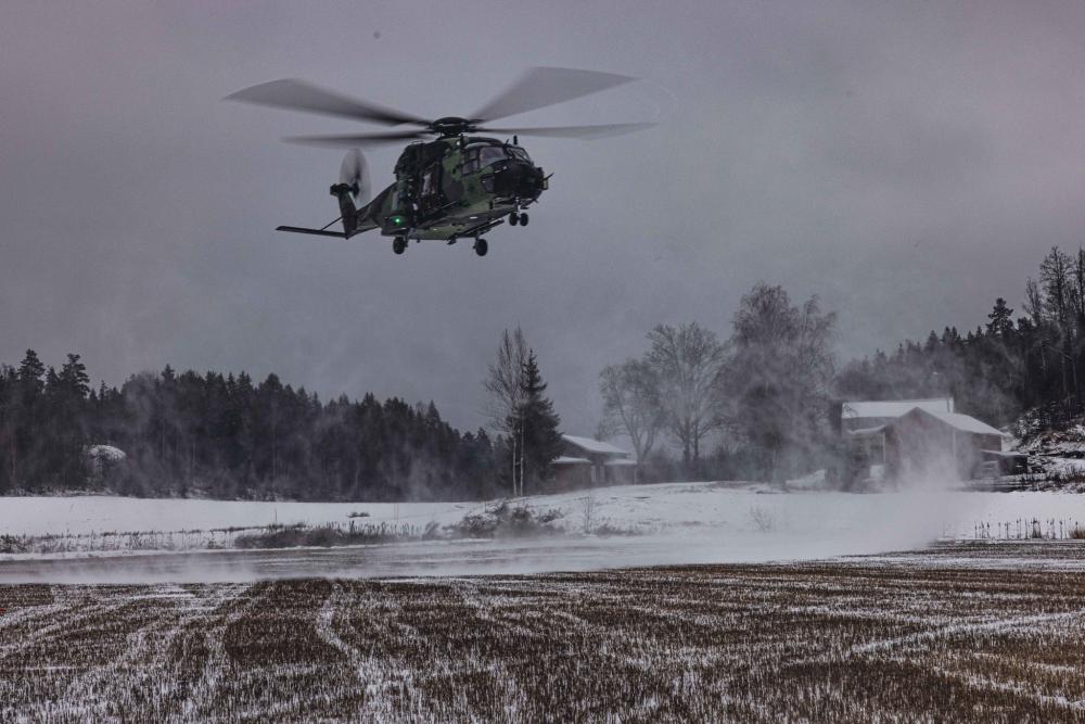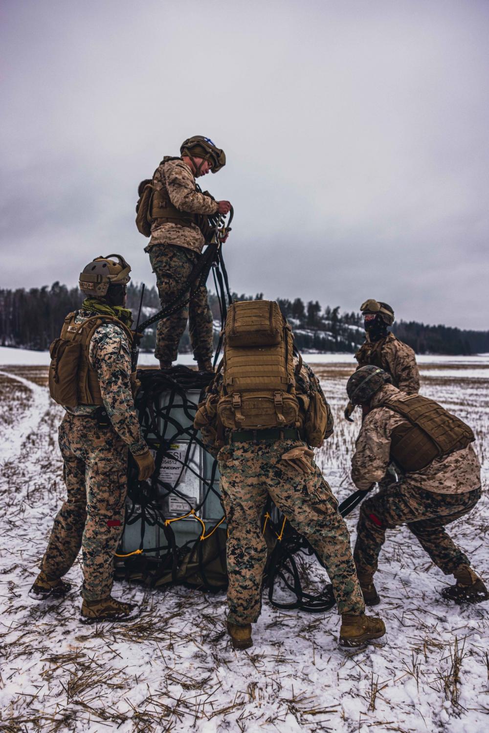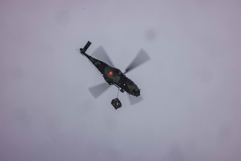 U.S. Marines with Combat Logistics Battalion 6 (CLB-6), Combat Logistics Regiment 2, 2nd Marine Logistics Group, conduct a helicopter lift with Finnish aircraft NH90 during Freezing Winds 22 in Gumbole, Finland Nov. 30, 2022. Task Force Red Cloud, headquartered by elements of CLB-6, is deployed to Finland in support of Exercises SYD 2022 and Freezing Winds 2022 to enhance U.S. and Finnish select interdependence in the maritime domain; solidify bilateral maritime maneuver within the Finnish littoral environment; and foster strong relationships between U.S. Marine Corps and Finnish Defense Force sustainment units. (U.S. Marine Corps photos by Cpl Jackson Kirkiewicz)