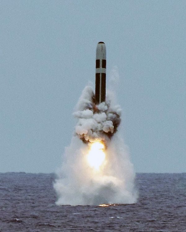 An unarmed Trident II D5 missile launches from the Ohio-class fleet ballistic-missile submarine USS Maryland (SSBN 738) off the coast of Florida. (U.S. Navy Photo by John Kowalski/Released)