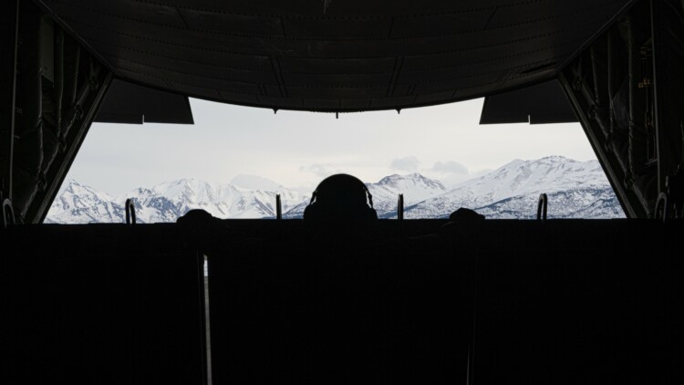 An Airman looks out the back of MC-130J Commando II aircraft while taxiing during Arctic Edge 24, Alaska. (Image source: DVIDS)