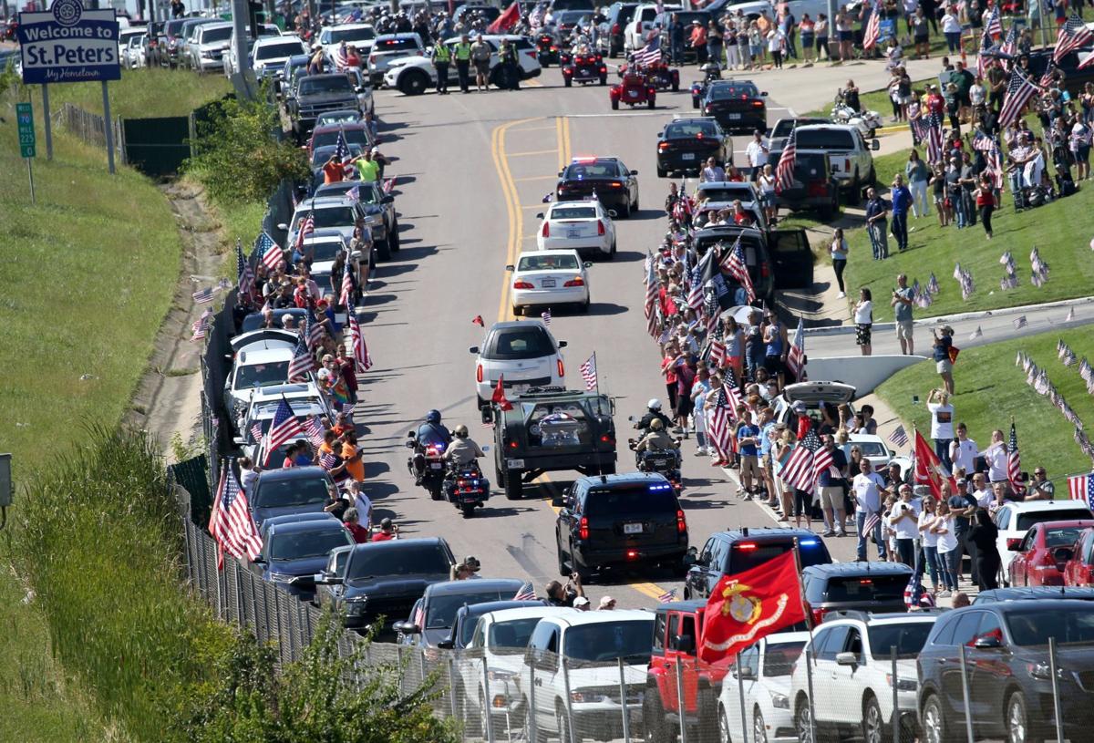 United States Marine Corps Lance Corporal Jared Schmitz made his final pass down the highways of St. Louis in a military Hummer in the early afternoon of September 16, 2021. LCpl Schmitz was escorted by dozens of St. Charles, St. Louis, and Missouri Highway Patrol Officers in addition to untold hund