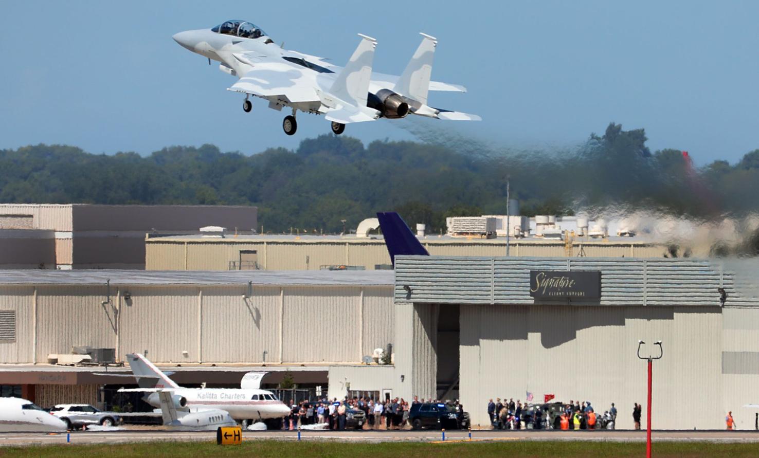 An F-15 lifts off as the remains of Marine Lance Corporal Jared Schmitz arrive at Signature Flight Support at St. Louis Lambert International Airport on Wednesday, Sept. 8, 2021. (Photo by Robert Cohen/St. Louis Post Dispatch)