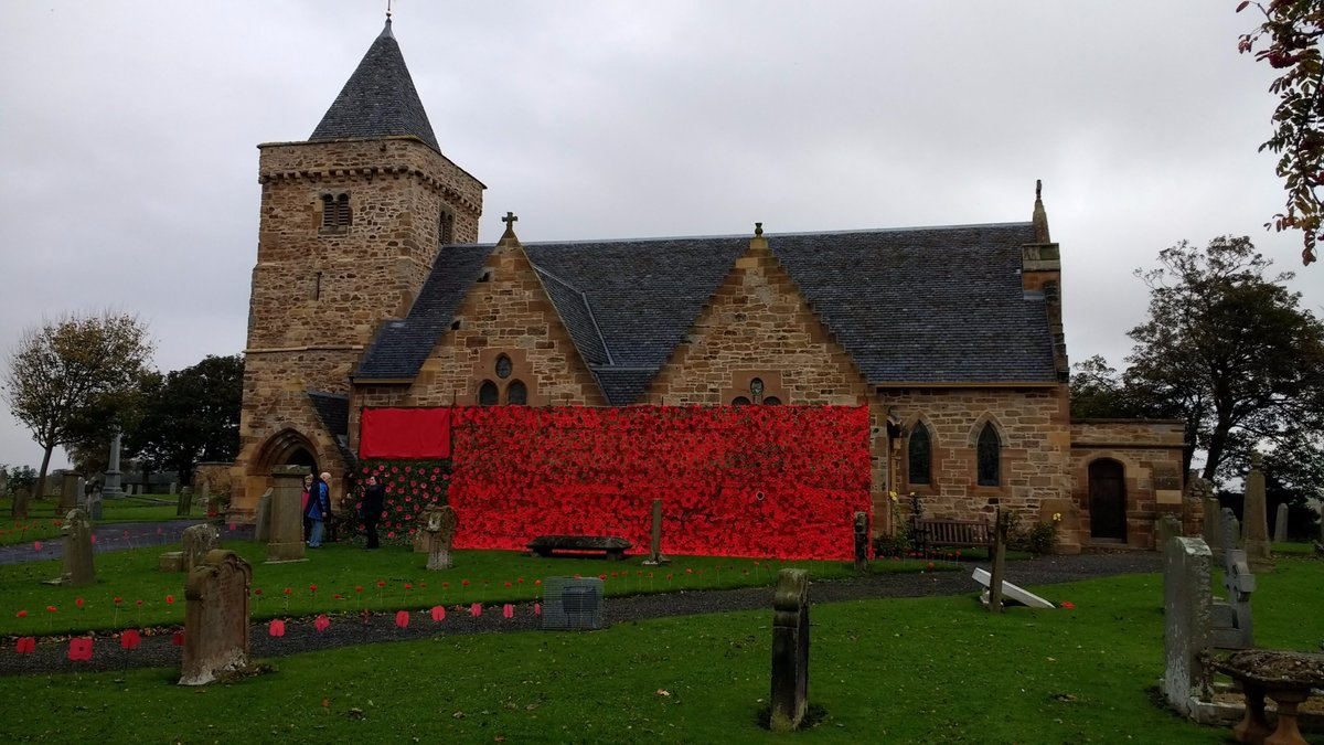In Scotland, Aberlady Parish Church erected a wall of red poppies with 6,000 individually knitted poppies. The organizers were inspired by the 2014 Tower of London display, when 888,246 poppies, each for a dead Commonwealth soldier, had formed an ocean of red.