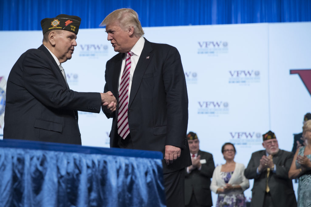 Republican presidential candidate Donald Trump shakes hands with VFW Commander in Chief John A. Biedrzycki during a Veterans of Foreign Wars convention, Tuesday, July 26, 2016, in Charlotte, N.C. | AP Photo/Evan Vucci