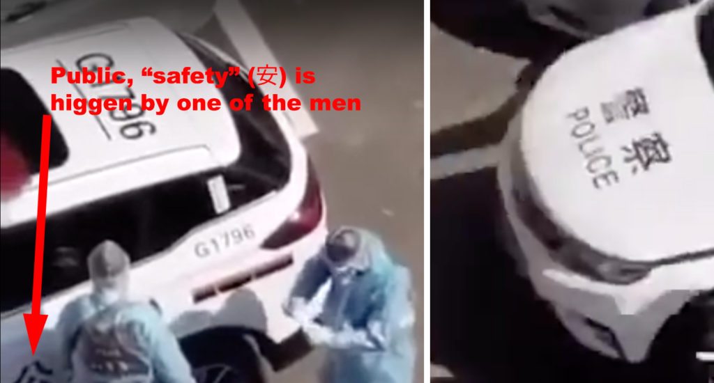 At the beginning of the video, we see three men clad in a minor medley of Personal Protective Equipment. They are clearly loading Assault Rifles and semi-automatic pistols. The Chinese characters on the left driver’s door say “Public Safety.” The characters on the hood of the car say (as does the English) “Police.” It strikes me as funny-odd that a province in China — Hu Bei (湖北) — has “Police” in English. Does America really have such influence there?