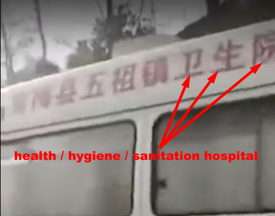 Toward the end of the film, there is a bus-type vehicle with an indication of the city and prefecture in which it is in service, followed by “Weī Sheng Yuàn (卫生院), meaning “hygiene, sanitation, health hospital.” This puts me plumb in mind with the American version of an ambulance — “bambalamps” if you are from sectors of Tennessee.