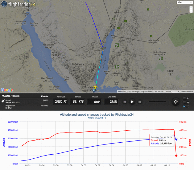 To recap the tragic flight, Metrojet 9268 took off from Sharm el-Sheikh International Airport headed for St. Petersburg at 5:51am local time (03:51UTC). At 6:14am, 23 minutes later, the aircraft disappeared from radar screens.