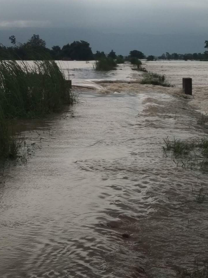 This image is of the same bridge depicted in the video above.The rice paddies in this village are completely flooded; the road and bridge accessing the village are gone.