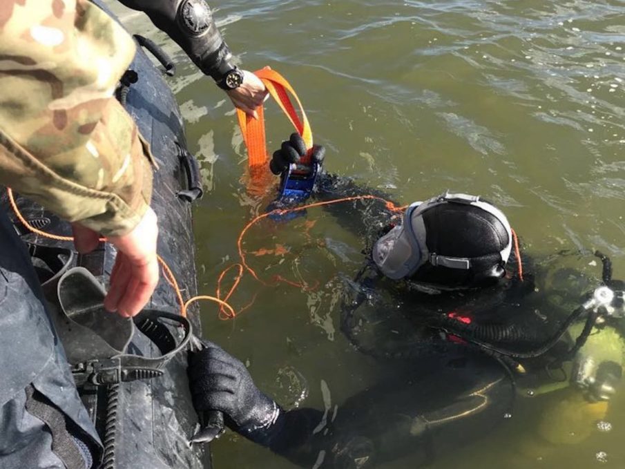 Royal Navy divers assist in preparations to float the bomb down the River Thames and out to sea. (MOD Photo)