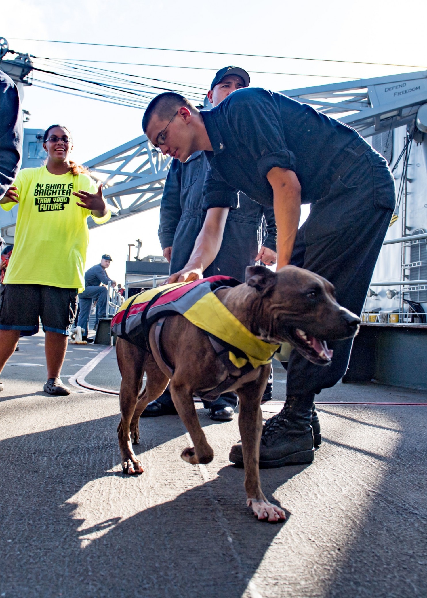 A sailor greets Zeus the dog with his owner, Tasha Fuiaba, on the USS Ashland. (U.S. Navy)