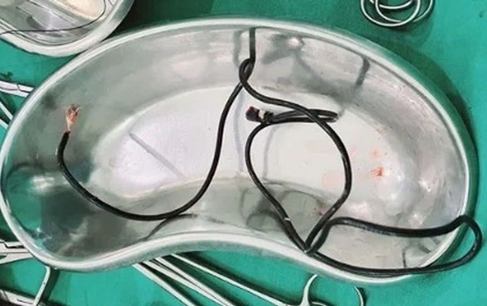 The phone charging cord after it was removed from the patient and placed in this emesis basin.